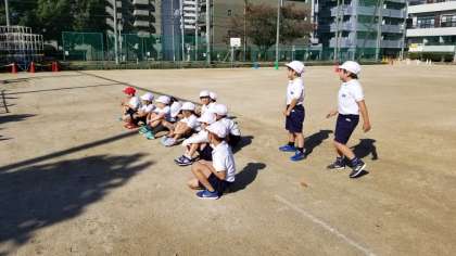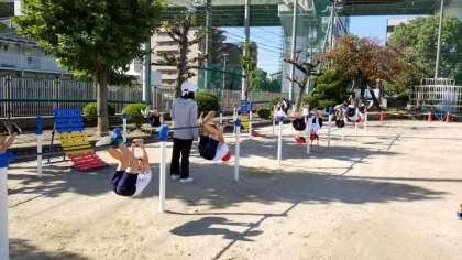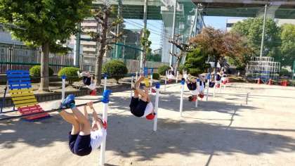 友だちからの声援をうけて、30秒を目標に鉄棒にぶら下がっています。