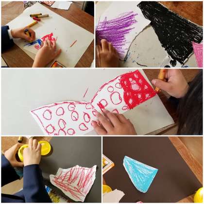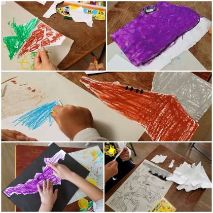 自由に破いた紙を見て・・・これは○○に見えるよ!と自由な発想で作品を作っています。