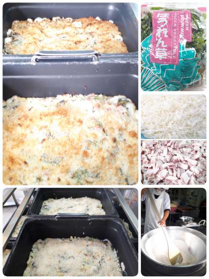 ほうれんそうのグラタンは、冷凍ほうれんそう・たまねぎ・ベーコン・マカロニを使用したホワイトソースのグラタンです。クリームを使用しているのでコクが出て、焼き上がりは粉末チーズのいい香りがしていました。