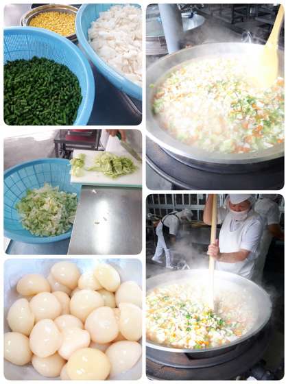 スープ煮は、鶏肉・にんじん・だいこん・キャベツ・コーン・さんどまめを使用し彩りよく仕上げています。