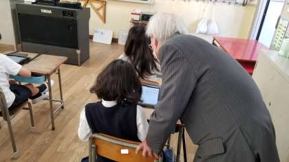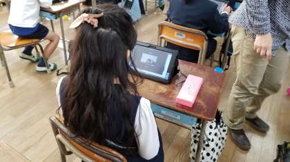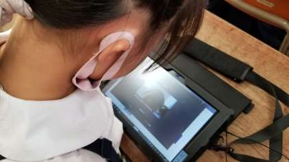 自分の顔がタブレット端末に映ると、みんな大興奮です!