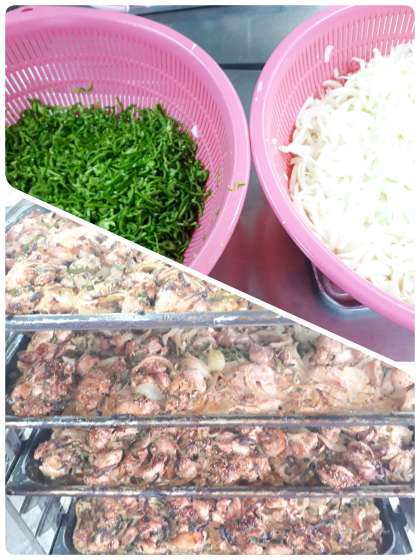 鶏肉のごまだれ焼きは、ねりごまを使用した調味液で下味をつけた鶏肉にたまねぎ・ピーマンを混ぜ合わせ、いりごまをふり焼きもの機という機械で焼いています。