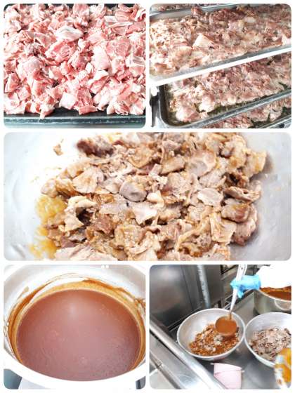 豚肉のデミグラスソースは、料理用ワイン・塩・粗挽こしょう・オリーブ油で下味をつけて焼きもの機という機械で焼いた豚肉(かたロース)に、りんごピューレ・デミグラスソース・ウスターソース・ケチャップで作ったソースをからませています。