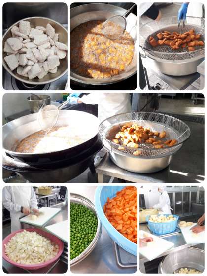 カツカレーライスは、にんにくを香り良くいため牛肉・にんじん・たまねぎ・じゃがいもを使用したカレーライスに、ひとり1個の一口トンカツがつきます。