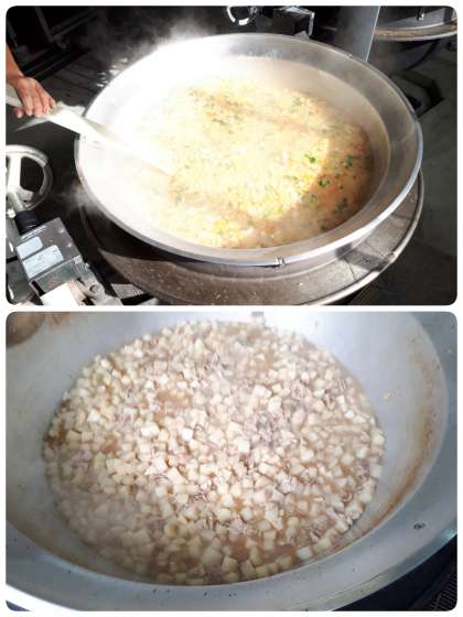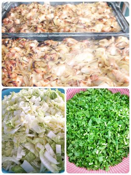 鶏肉の甘辛焼きは、鶏肉に料理酒・砂糖・みりん・こいくちしょうゆで下味をつけ、たまねぎを混ぜ合わせ、焼きもの機で蒸し焼きにしています。
