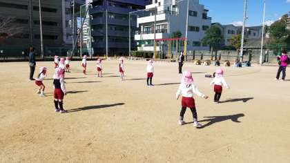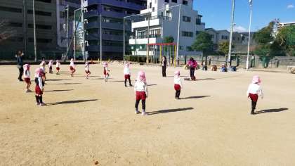 『らーめんたいそう』で、体をほぐしたあとは、園庭よりも広い運動場を、思い切り走り回って、たこをあげていました。