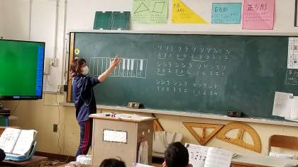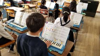 「山のポルカ」を、鍵盤ハーモニカで演奏するために、指番号を確認しています。
