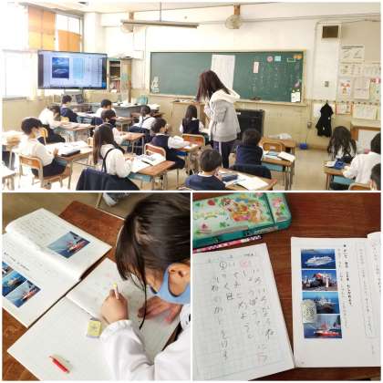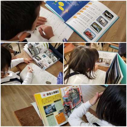 教科書の文例を真似ながら、自分で選んだ「働く自動車」についてまとめています。