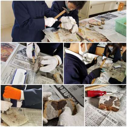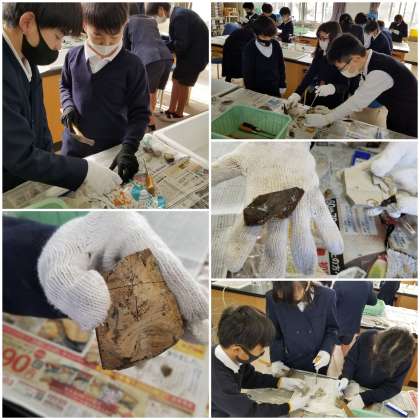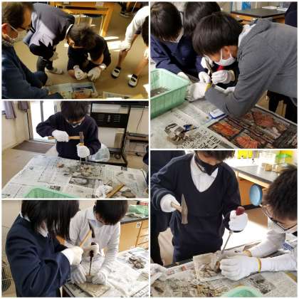 理科室では、化石発掘体験をしています。