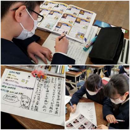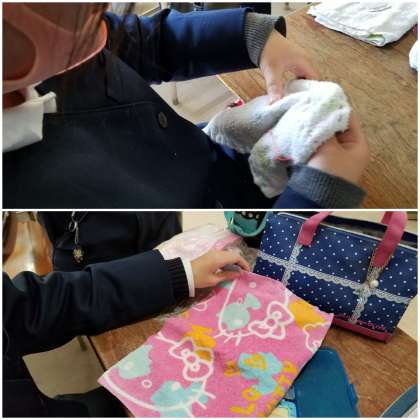 6年生は、卒業記念の「雑巾」づくりをしたり、歴史新聞を書いたり、卒業文集の制作に取り組んだりしています。
