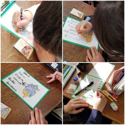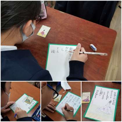 そこで、自分のお気に入りのものを図画工作科の時間に、少し大きな「百人一首」を作ることにした4年生です。