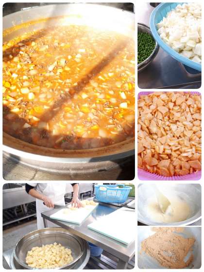 ビーフシチューは、牛肉・じゃがいも・たまねぎ・にんじん・グリンピースを使用し、小麦粉と綿実油で作ったブラウンルウで煮込んでいます。