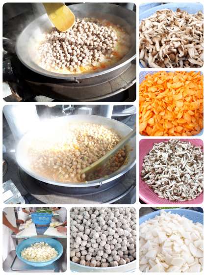 ミートボールと野菜のカレー煮は、肉だんご・にんじん・たまねぎ・だいこん・しめじ・青みにむきえだまめを使用し、カレールウの素等で味つけしています。