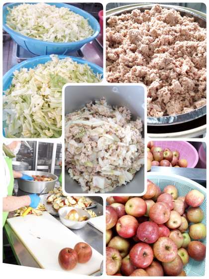 今日の献立は、ミートボールと野菜のカレー煮・ツナとキャベツのソテー・りんご・黒糖パン・牛乳でした。