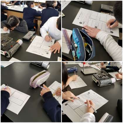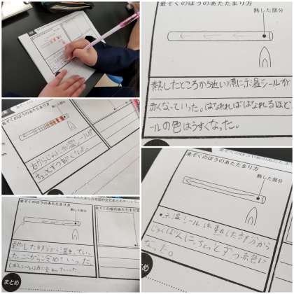 子ども達は、実験結果を「示温シールの色は、熱したところから少しずつ順に色が変わっていった。」と、自分の言葉でまとめました。