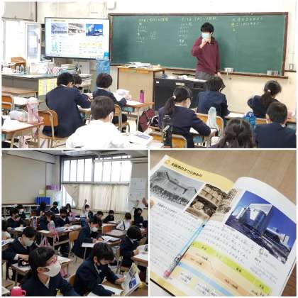 明治・大正・昭和・平成と時代別の大阪駅の写真を見ながら、大阪市のうつりかわりについて学習しています。