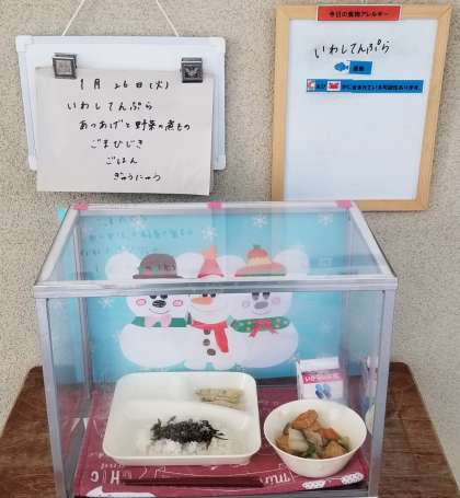 今日の献立は、「いわしてんぷら あつあげと野菜の煮物 ごまひじき ごはん 牛乳」です。