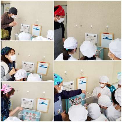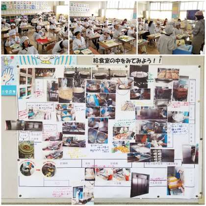 給食室前には「全国学校給食週間」にちなんで、給食室内の様子が展示されていて、みんな興味津々で見ていました。