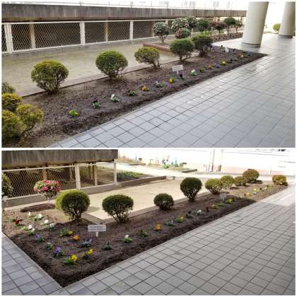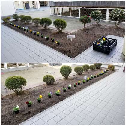 講堂前の花壇に、管理作業員さんがきれいな花が植えました。