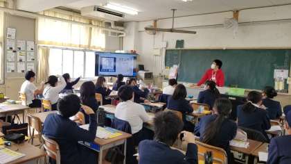 大型液晶に映った「我」の字を見ながら、新出漢字について学習しています。