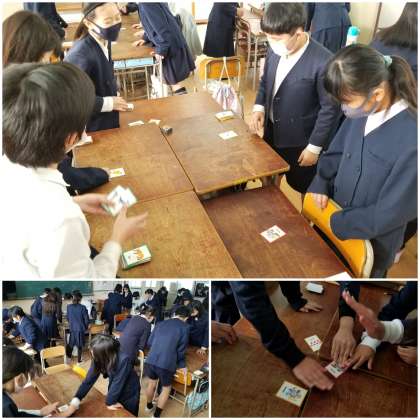 5年生が英語の時間に、英単語が書いてあるカードを使ってかるた遊びをしています。