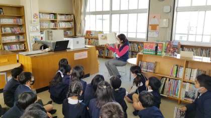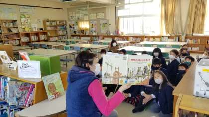 3年生が、「3びきの かわいいオオカミ」という絵本の読み聞かせをしてもらっていました。