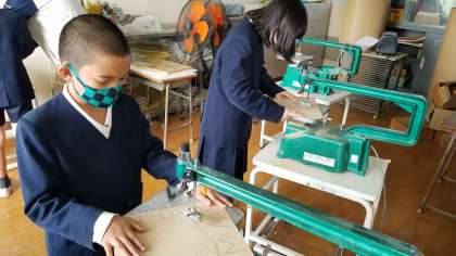 先生にアドバイスをもらいながら、安全に気を付けて電動糸鋸を使っています。