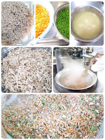 鶏ごぼうご飯は、しょうが汁で下味をつけた鶏ひき肉・つきこんにゃく・ごぼう・にんじん・グリンピースを使用した具材を、食べる時にご飯と混ぜ合わせ、きざみのりをかけて食べます。しょうがの風味がきいていて、大人気でした〜。