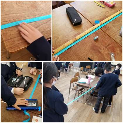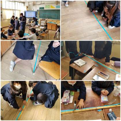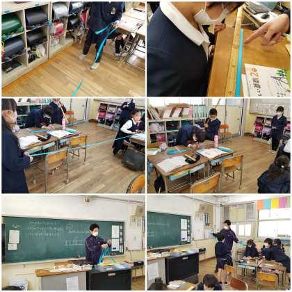 3メートルの紙テープに、1メートルの物差しを使って、1メートルごとにめもりを書きます。