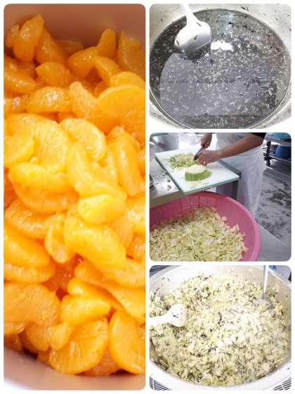 キャベツのひじきドレッシングは、からいりしたひじきに砂糖・米酢・塩・うすくちしょうゆ・綿実油を合わせたドレッシングを、蒸したキャベツにかけてあえています。