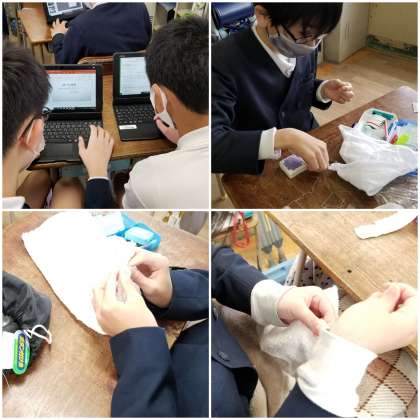 在校生に贈る「ぞうきん」を縫っている子どもや、タブレット端末を使ってプレゼンテーションする準備を進めている子どもがいます。