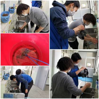 教室で飼っている金魚の「一郎&次郎」の水槽を、きれいにしています。