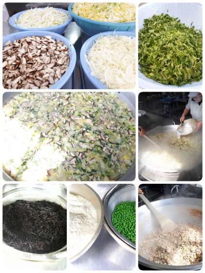 うすくず汁は、はくさい・だいこん・たまねぎ・しいたけ・みつばを使用し、でんぷんでとろみをつけています。