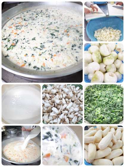 ほうれんそうのクリームシチューは、鶏肉・ほうれんそう・じゃがいも・たまねぎ・にんじん・エリンギが入った彩りのよいシチューで、手作りのルウを使用し、クリームでコクを出しています。