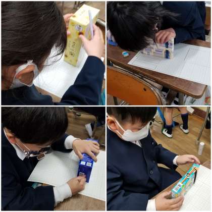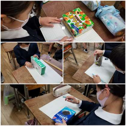 今日は、箱の面を写し取って、それぞれの面がどのような形をしているのかを確認しました。