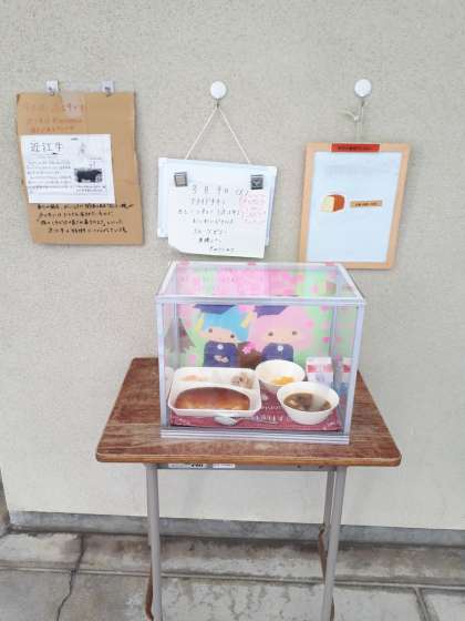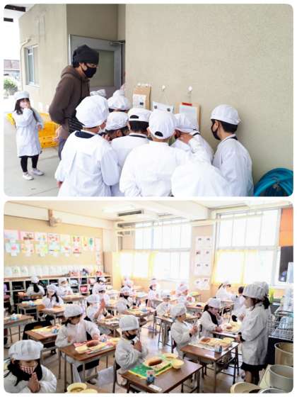 今日の展示食前は、『フライドチキンは、骨付きかな〜』『おいわいピクルスやってー』『フルーツゼリー楽しみ〜』『近江牛や〜』など児童がとても盛り上がっていました。