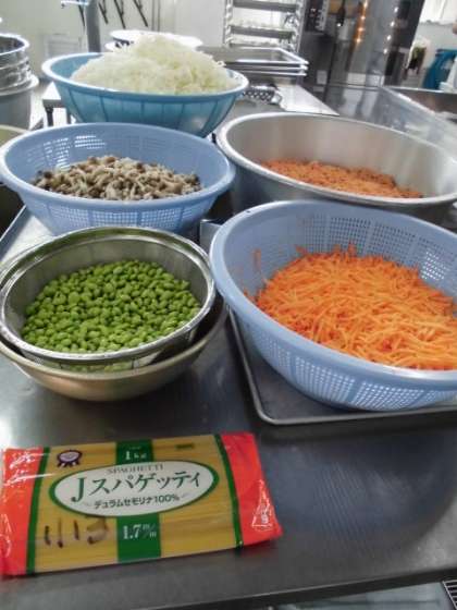 さけのクリームスパゲッティは、紅ざけフレーク・ベーコン・たまねぎ・にんじん・むきえだまめ・しめじ・牛乳・クリームを使用したスパゲッティで、ベーコンやクリームでうま味やコクを出しています。