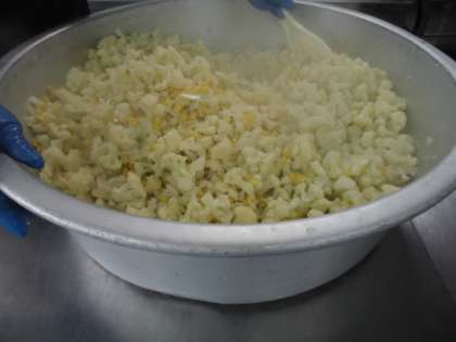 カリフラワーとコーンのサラダは、カリフラワーとコーンを焼きもの機で蒸して、手作りのドレッシングであえています。