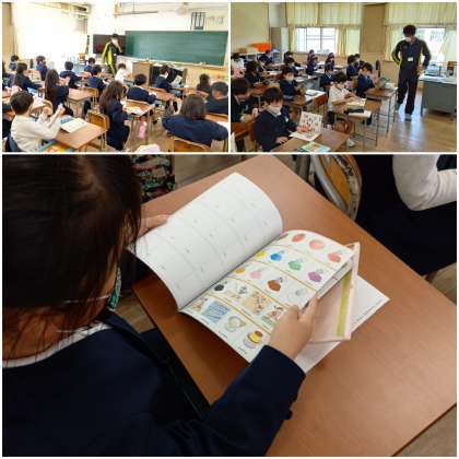 3年生は、英語の教材を配付してもらいとても嬉しそうです。