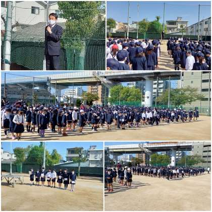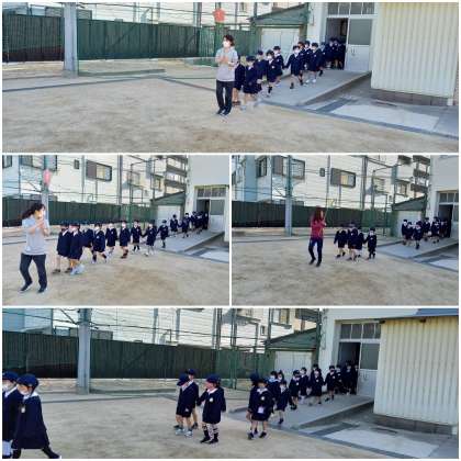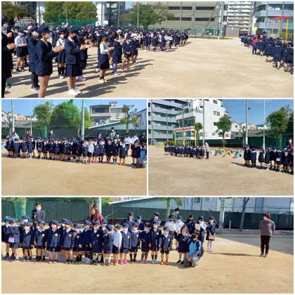 晴天の中、運動場で「1年生を迎える会」を開きました。