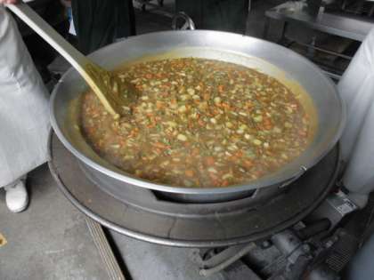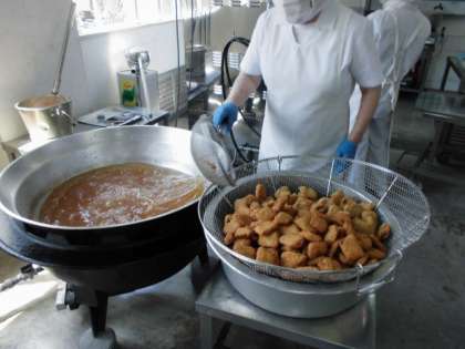 カツカレーライスは、にんにくを香りよくいため、牛肉・たまねぎ・にんじん・じゃがいもを入れ、大きな釜でじっくり煮込んでいます。じゃがいもは、ホクホクでした♪