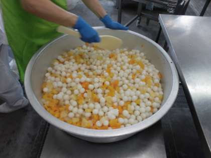 フルーツ白玉は、白玉だんごを焼き物機という機械で蒸し、砂糖・水で作ったみつにつけ、ミックスフルーツ缶と合わせています。
