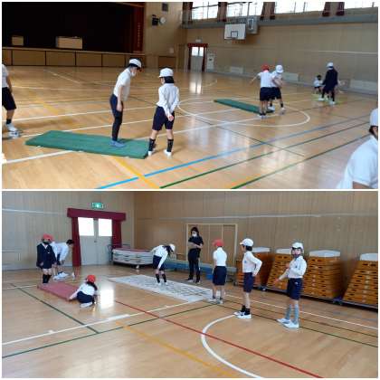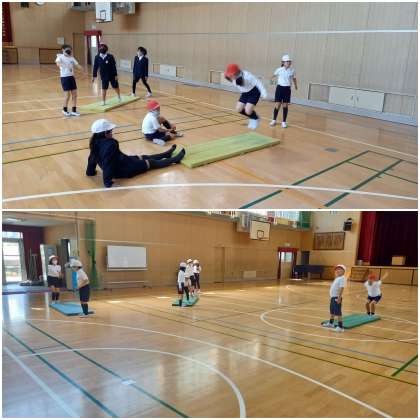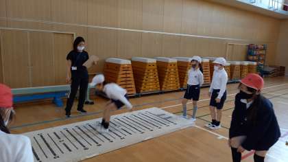 グループごとに練習したあと、立ち幅跳び用マットを跳び記録をとっています。