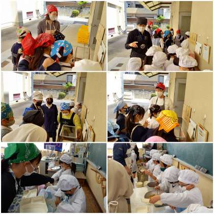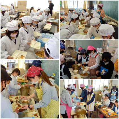 給食当番は、ビビンバの具材(野菜とひき肉)をバランスよく配膳しています。