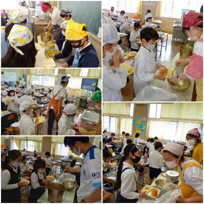 スープとスパゲッティのバランスを考えながら、子ども達は上手に配膳していました。