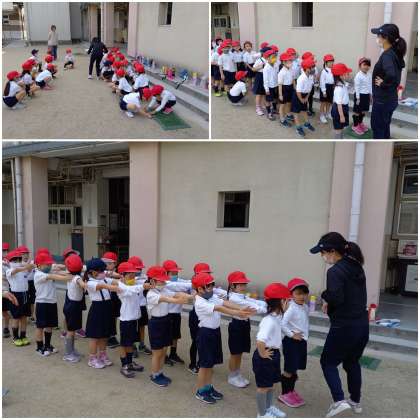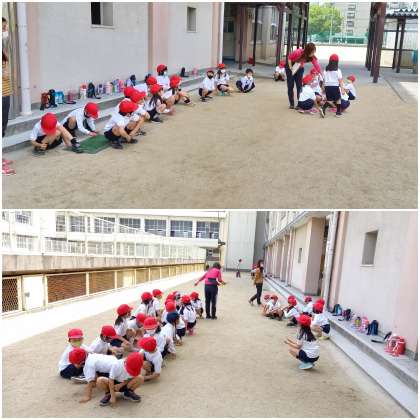 先生の合図で、整列したり、その場に体育座りをしたりしています。