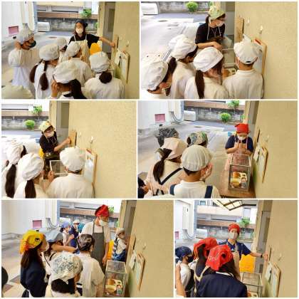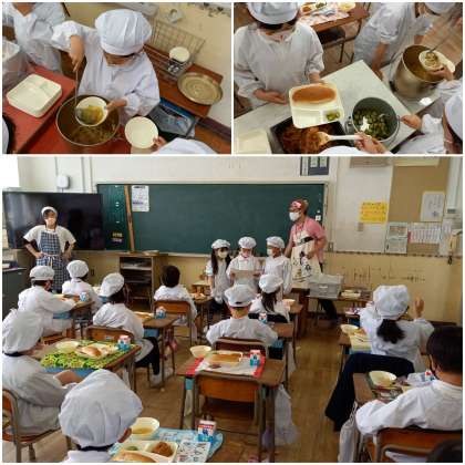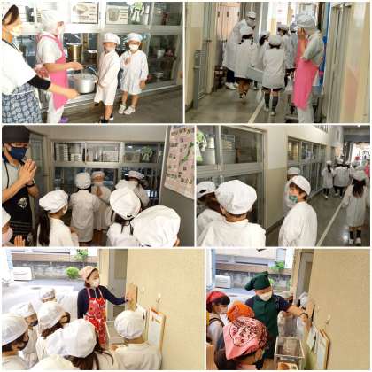 給食当番は、配膳方法を展示食を見て確認しています。