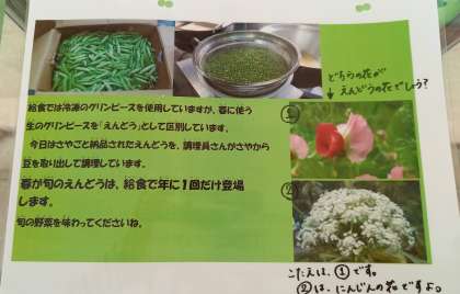 給食では、冷凍のグリンピースを使いますが、春に使う生のグリンピースを「えんどう」として区別しています。