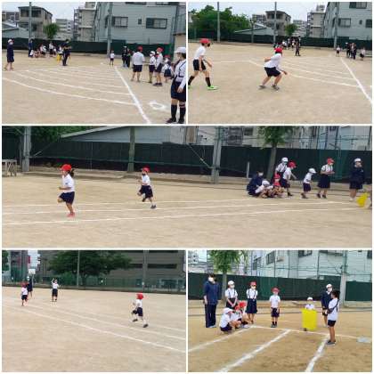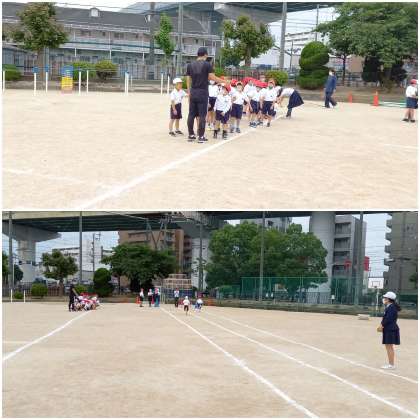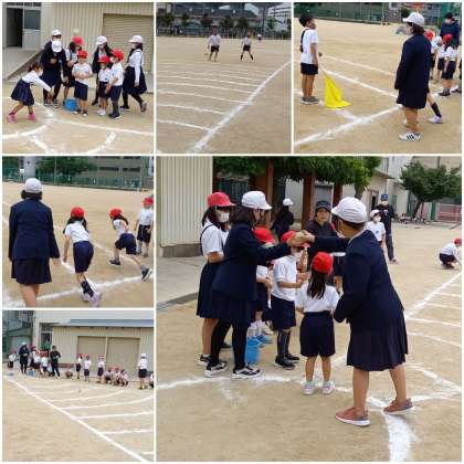 6年生がサポートしながら、1年生はスポーツテストに取り組んでいます。