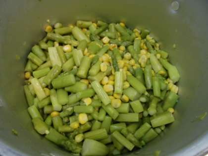 グリーンアスパラガスのソテーは、旬の生のグリーンアスパラガスとコーンをオリーブ油でいため、塩・こしょうで味つけしています。素材の味を感じられる献立でした。